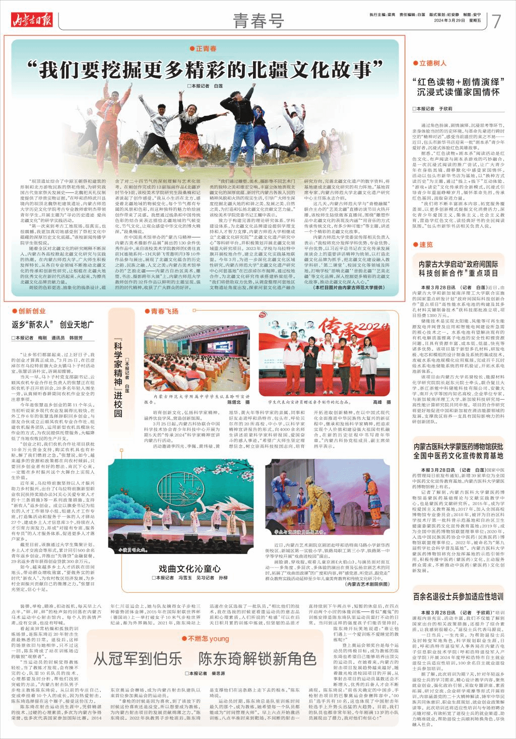 随着全区对北疆文化的研究阐释不断深入,内蒙古各高校掀起北疆文化研究与实践的热潮。在pp电子官方网站,广大师生积极发挥特长,从各自专业领域不断推动北疆文化的传承和创新性研究,让根植在北疆大地的优秀文化在新时代活起来、火起来,为擦亮北疆文化品牌贡献力量。