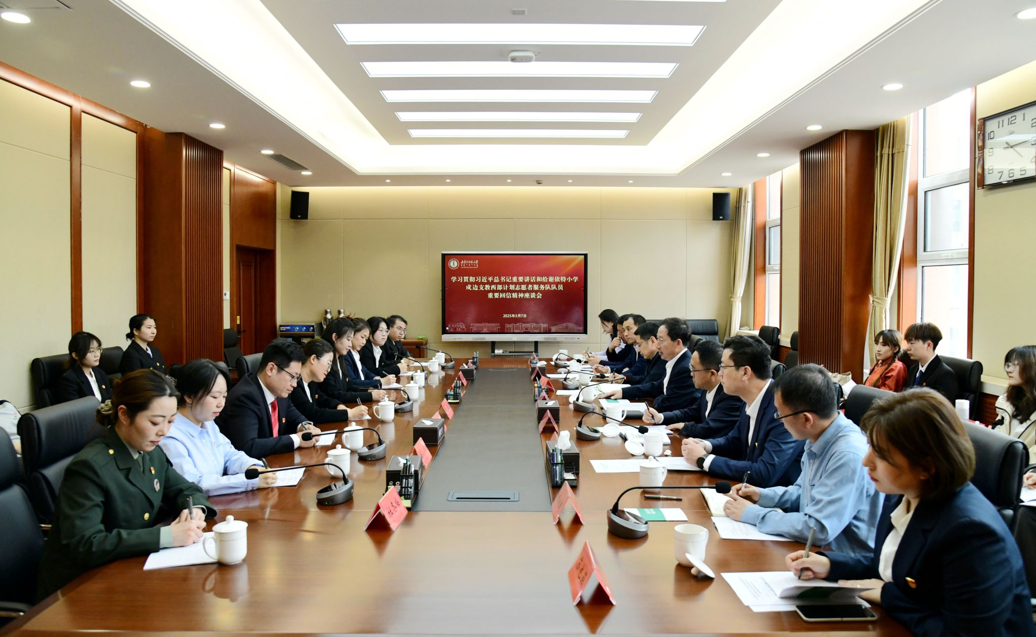 本网讯 5月7日,pp电子学习贯彻习近平总书记重要讲话和给谢依特小学戍边支教西部计划志愿者重要回信精神座谈会在盛乐校区行政楼306会议室召开。党委书记李树林,党委副书记斯钦出席座谈会。党委委员、副校长韩巍主持座谈会。相关部门负责同志以及青年师生代表参加座谈会。