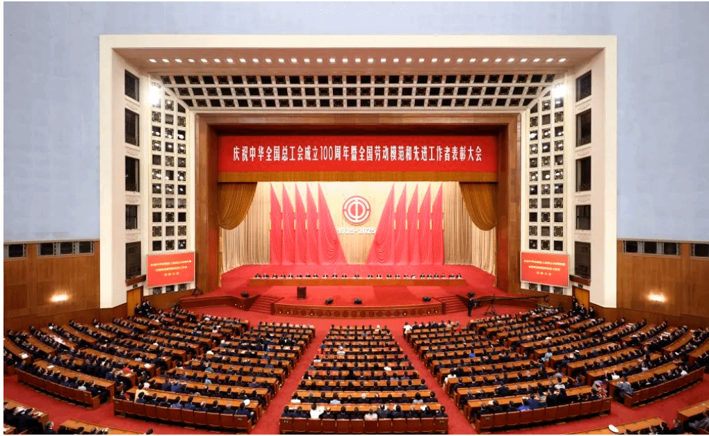 4月28日上午,庆祝中华全国总工会成立100周年暨全国劳动模范和先进工作者表彰大会在北京人民大会堂隆重举行。新华社记者 丁海涛 摄