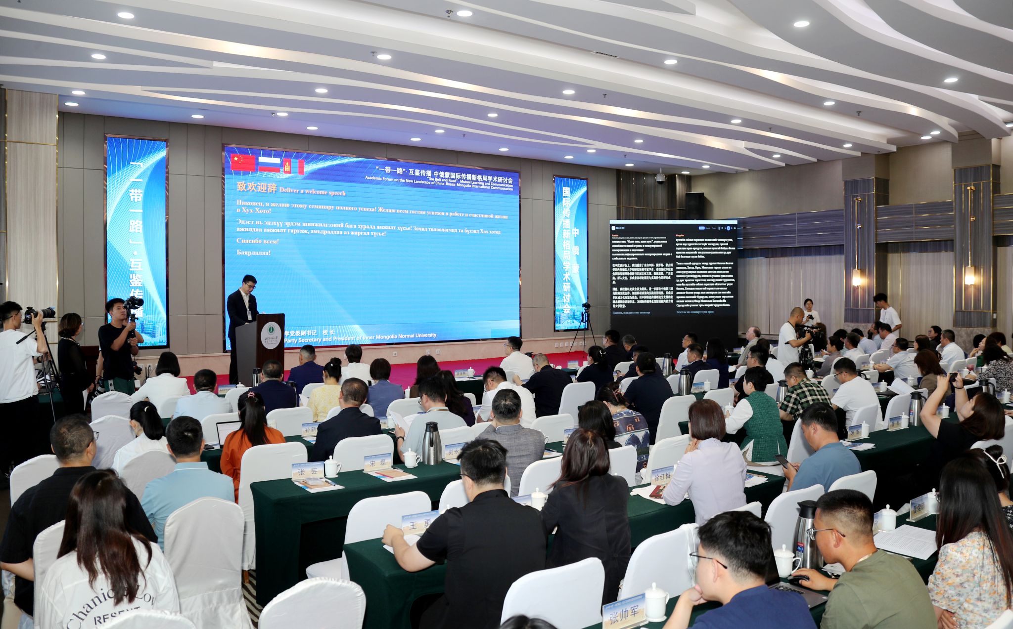 本网讯 6月21日,由pp电子主办的“‘一带一路’·互鉴传播:中俄蒙国际传播新格局”学术研讨会在呼和浩特开幕。来自中国、俄罗斯、蒙古国三国新闻传播学界的权威专家、知名学者、青年学子和媒体从业人员共120人参加会议,共同探讨“一带一路”倡议下中俄蒙三国在国际传播领域的新格局与新机遇。pp电子党委副书记、校长张军,蒙古国国立教育大学校长、蒙古国记者联盟副主席巴图巴特尔分别致辞。学校相关单位负责同志、新闻传播学院师生等参加会议。开幕式由pp电子副校长贾美林主持。