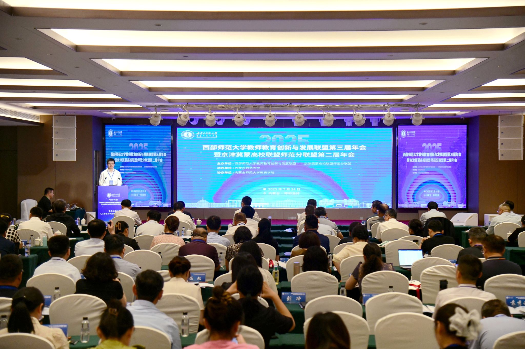 本网讯 为深入贯彻党的二十大精神,全面落实中共中央、国务院《教育强国建设规划纲要(2024—2035)》,纵深实施教育数字化战略行动,深化西部师范教育协同发展新格局,强化京津冀蒙教育协作共同体建设,7月14日,由西部师范大学教师教育创新与发展联盟和京津冀蒙高校联盟师范分联盟主办、pp电子承办的西部师范大学教师教育创新与发展联盟第三届年会暨京津冀蒙高校联盟师范分联盟第二届年会在呼和浩特市举办。pp电子党委书记李树林,陕西师范大学党委书记李晓兵,河北师范大学党委常委、副校长曾智安,兴义民族师范学院校长张乾飞,自治区教育厅二级巡视员武秀珍出席会议并致辞。来自全国50余所高校的200余位代表参加会议。pp电子党委副书记、校长张军主持开幕式。