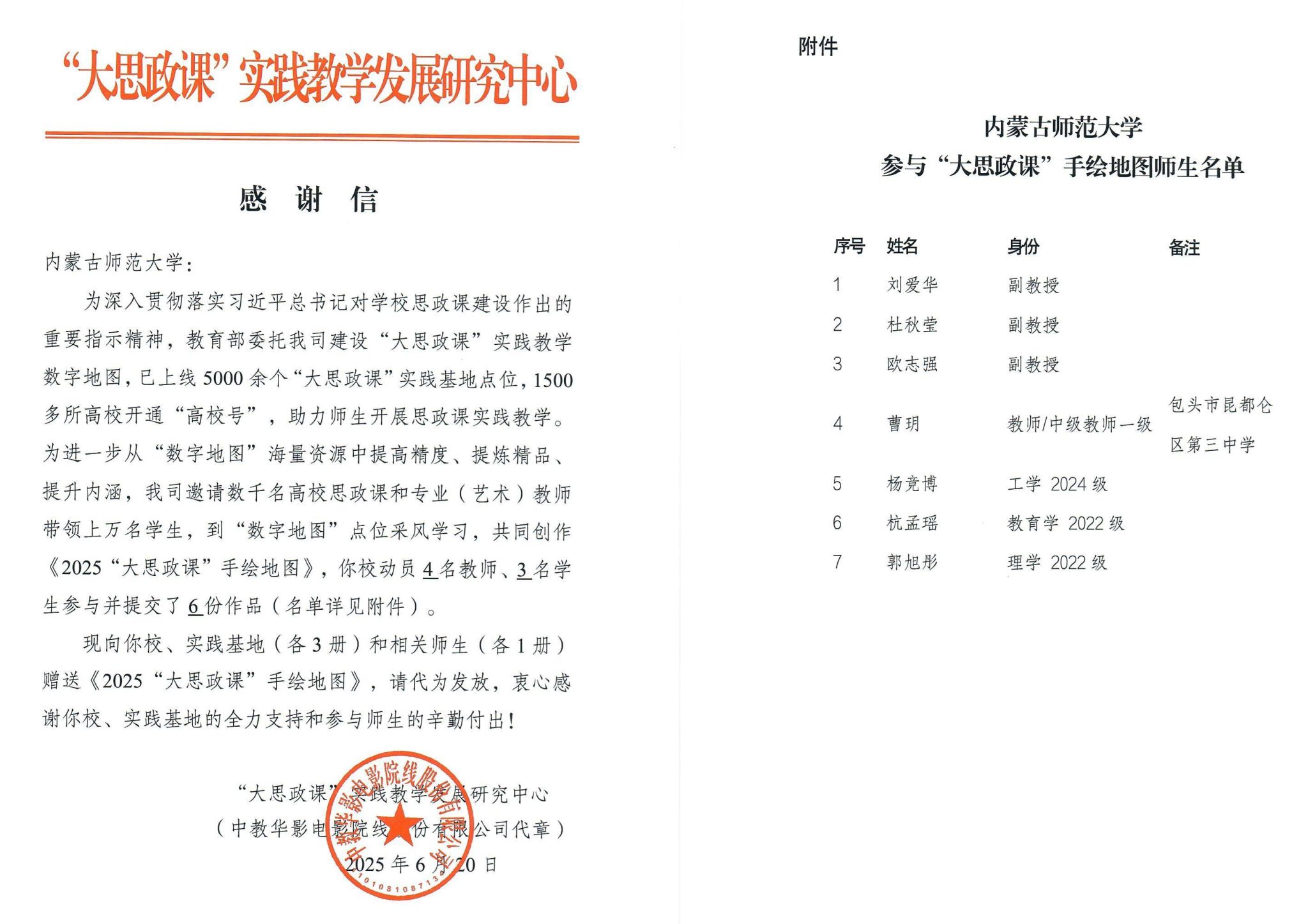 本网讯 近日,教育部“大思政课”实践教学数字地图项目成果“2025‘大思政课’手绘地图”正式发布。pp电子马克思主义学院副院长刘爱华领衔,并联合物理与电子信息学院部分师生、包头市九原区第三中学教师曹玥及学生团队、“阿拉善盟东风航天城”实践基地共同创作的思政实践教学资源成功入选,彰显了pp电子在思政课实践育人领域的创新成果。