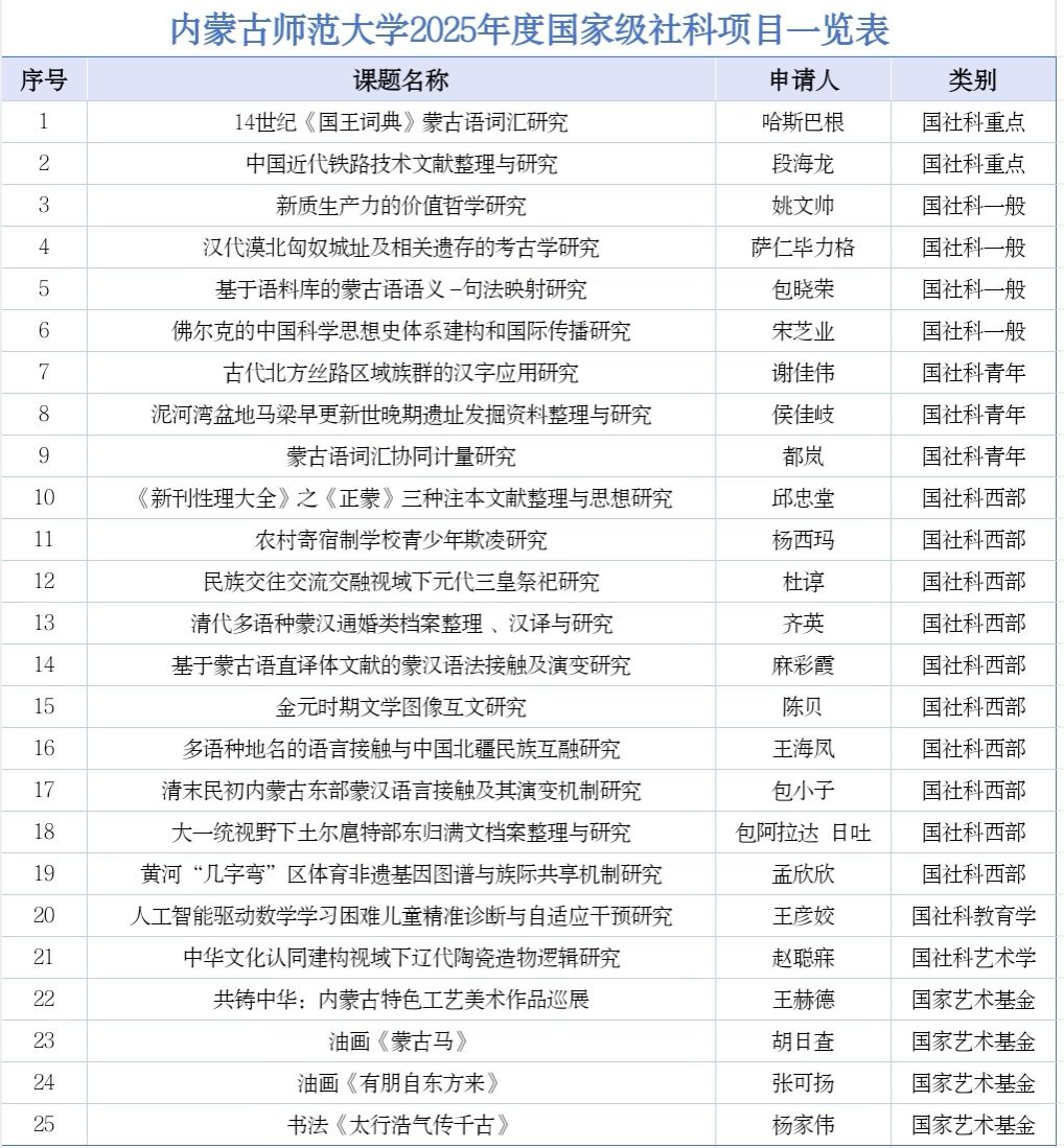 2025年初,国家艺术基金管理中心公布了2025年度国家艺术基金一般项目立项名单,pp电子获准立项4项。8月19日,全国哲学社会科学工作办公室公布了2025年度国家社科基金教育学立项名单,全国立项资助381项,内蒙古自治区获准2项,pp电子获准立项1项。9月4日,全国哲学社会科学工作办公室公布了2025年度国家社科基金艺术学项目名单,全国拟立项285项。内蒙古自治区获准立项2项,pp电子获准立项1项。