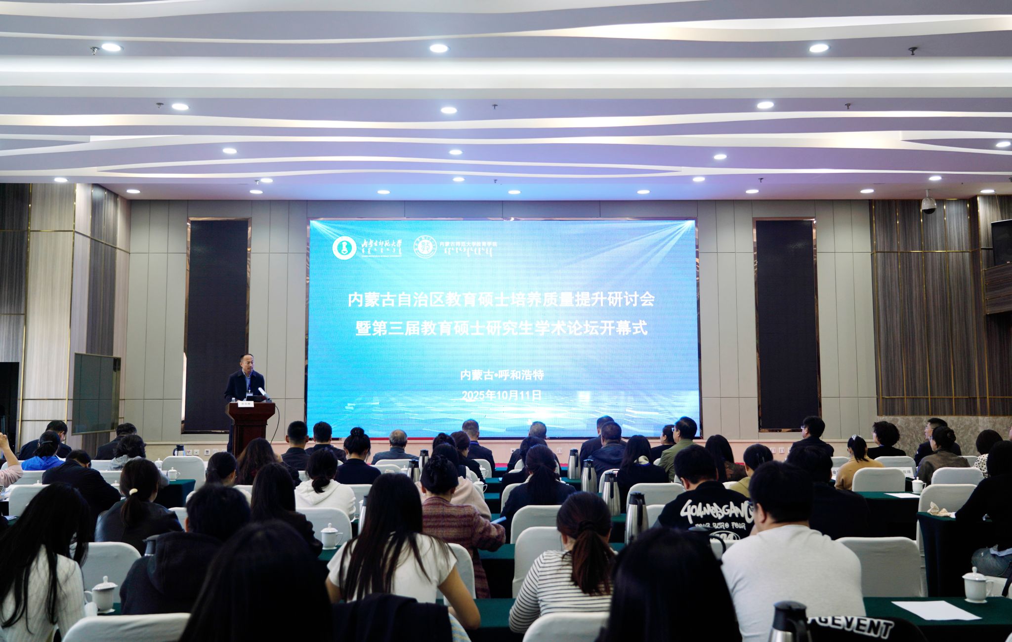 本网讯 10月11日,由pp电子官方网站主办,pp电子官方网站教育学院承办的“内蒙古自治区教育硕士培养质量提升研讨会暨第三届教育硕士研究生学术论坛”在呼和浩特市举办。校党委委员、副校长景剑峰出席论坛并致辞。
