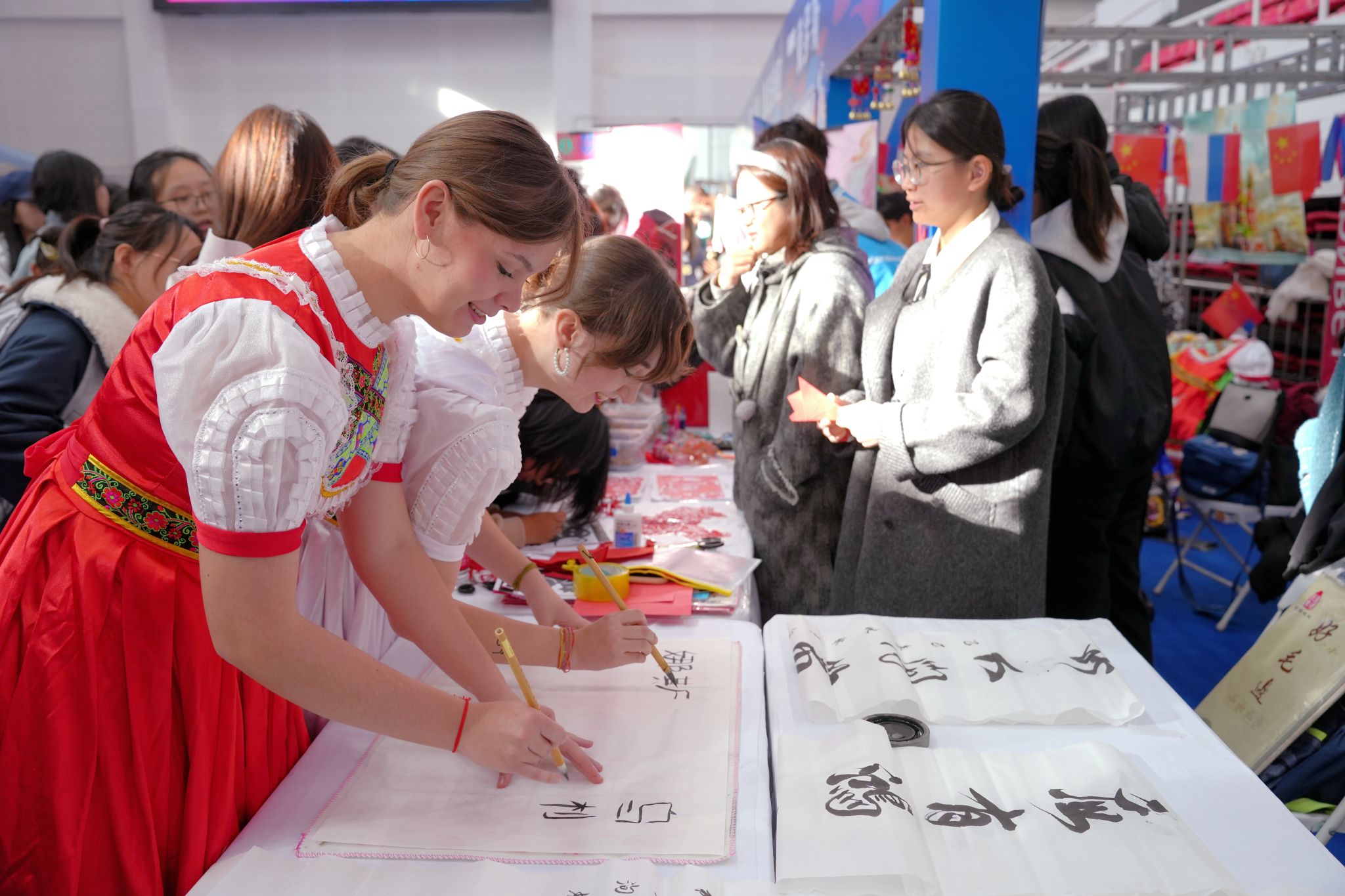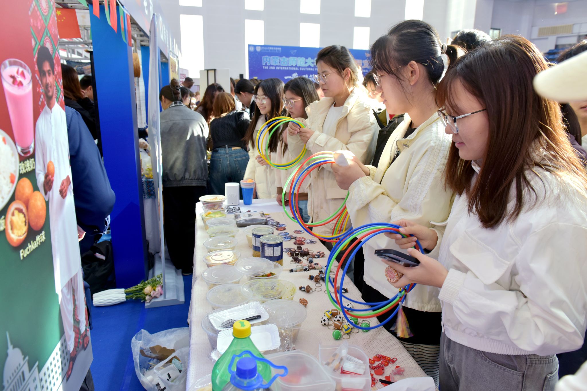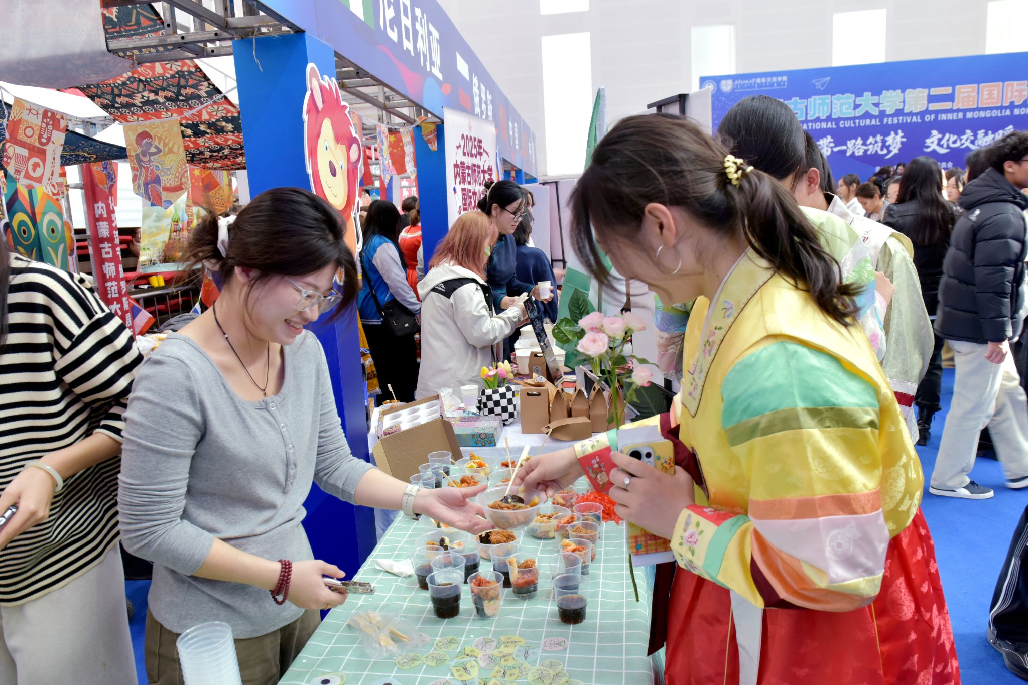活动现场,各国文化展区异彩纷呈。来自不同国家的学生通过特色工艺品、传统服饰、图片资料及地道美食,展示各自文化的独特魅力。巴基斯坦香米饭、哈萨克斯坦马肠、老挝青木瓜沙拉等美食备受青睐;中国剪纸、书法体验、香包制作、民族服饰试穿等传统文化也吸引众多师生参与。大家在亲身体验中增进理解,在交流互动中深化友谊。