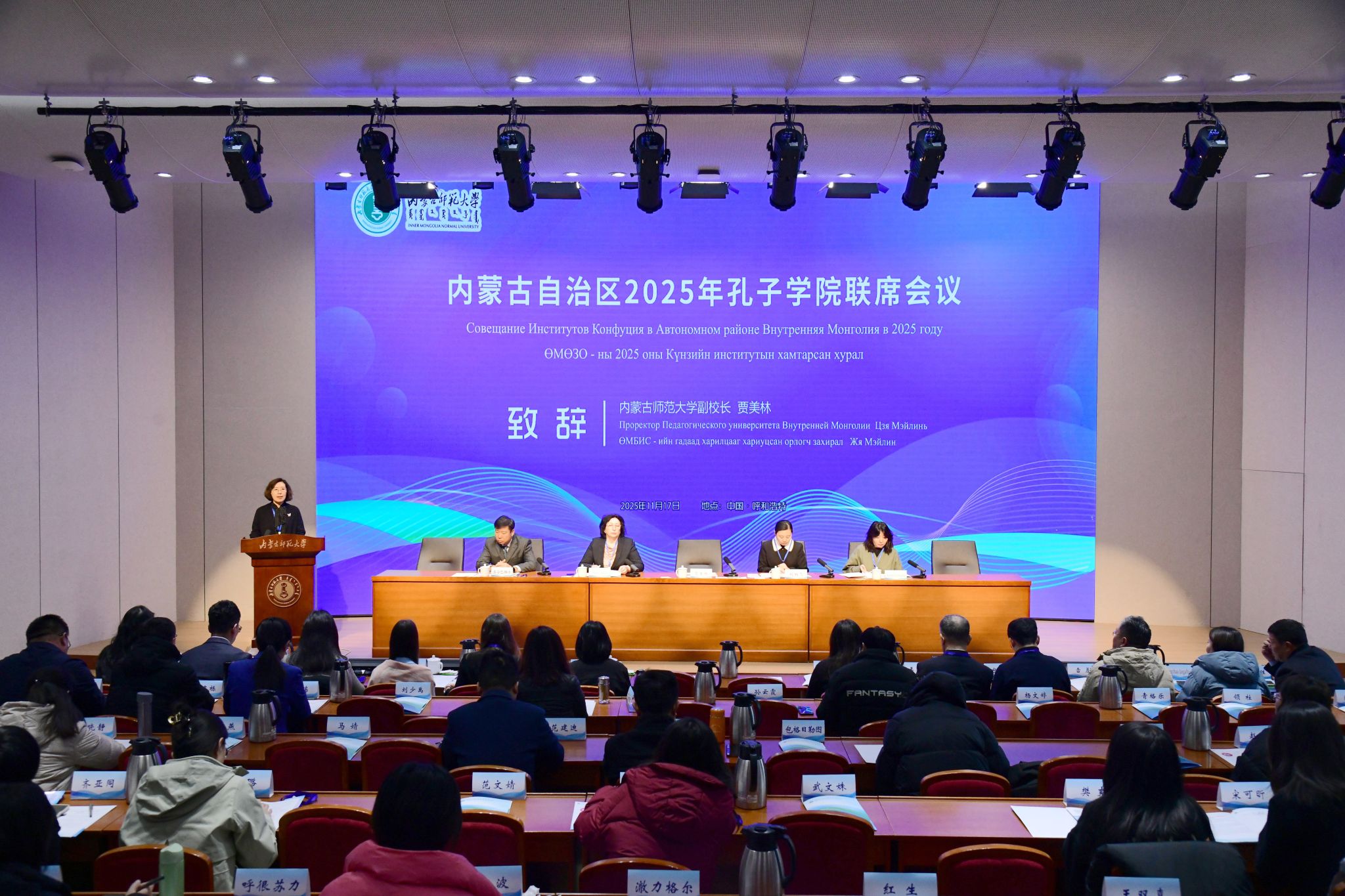 本网讯 为进一步推动内蒙古自治区国际中文教育高质量协同发展,11月17日,由内蒙古自治区教育厅指导,pp电子官方网站主办的内蒙古自治区2025年孔子学院联席会议在赛罕校区学术交流会议中心报告厅召开。自治区教育厅合作交流处处长刘相飞、pp电子副校长贾美林、俄罗斯克拉斯诺亚尔斯克阿斯塔菲耶夫国立师范大学副校长伊莉伊娜出席会议并致辞。来自我区的俄罗斯、蒙古国孔子学院和课堂合作院校代表及内蒙古自治区国际中文教育(孔子学院)联盟代表参加会议,共同分享交流孔子学院和课堂的建设发展经验。