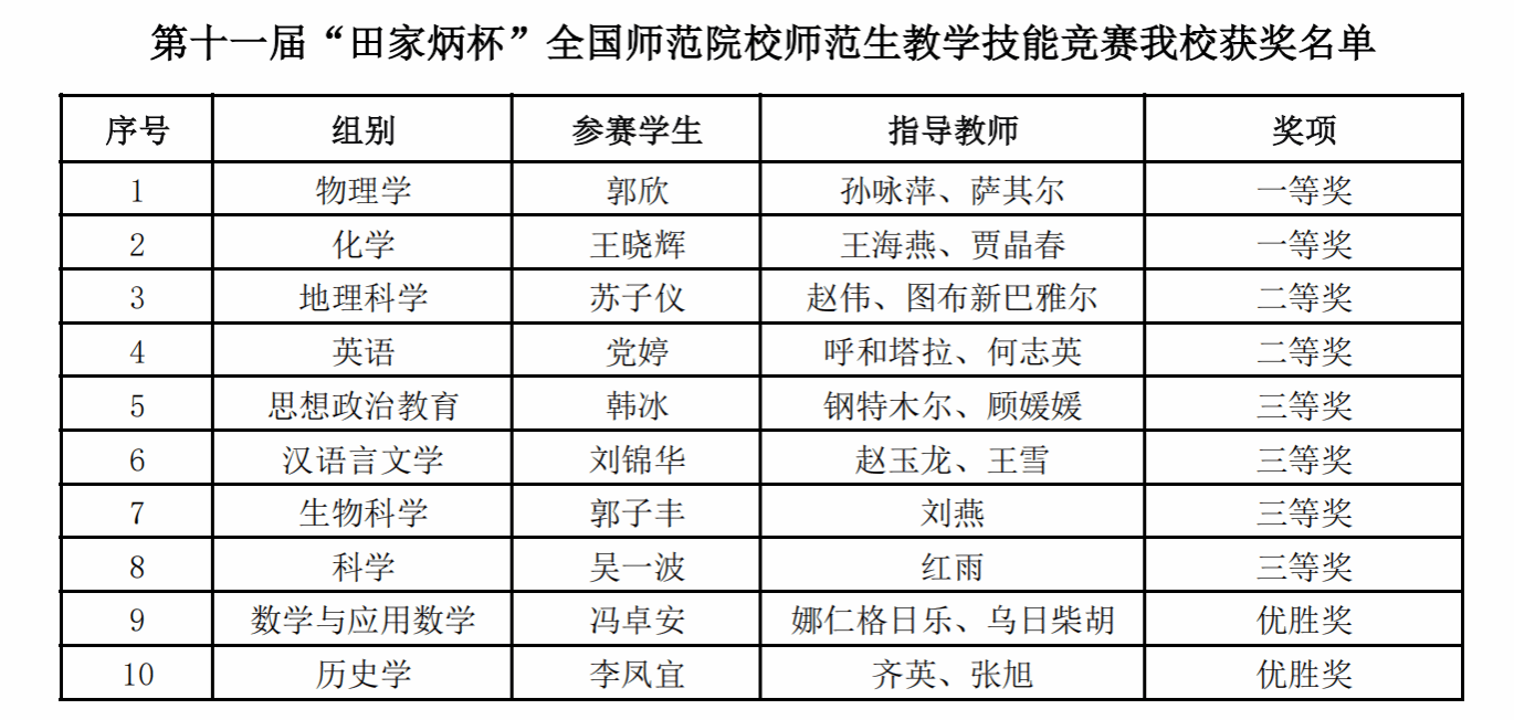 学校一直秉承“以赛促教、以赛促学、以赛促改、以赛促建”的长效机制,持续推进“院—校—省—国”四级竞赛体系,有效促进了师范生教学能力和水平的提升。下一步,学校将继续以教育家精神为引领,聚焦教师学科能力与素养双重提升,强化师范生教学实践与育人智慧培养,构建“专业筑基—实践赋能—情怀铸魂”的全链条育人体系,着力培养新时代高素质专业化教师队伍,助力自治区基础教育高质量发展。