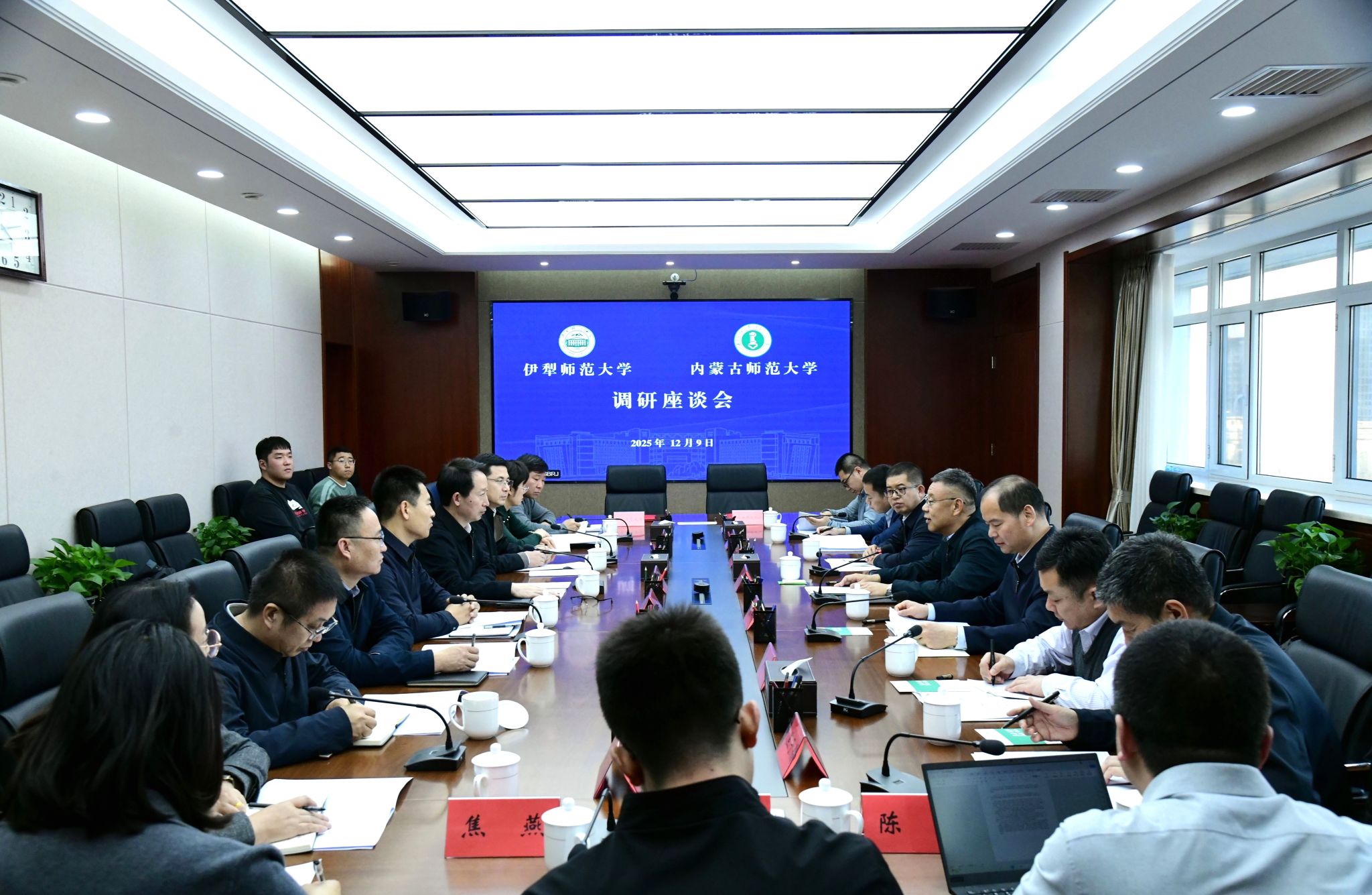 本网讯 12月9日,伊犁师范大学党委书记刘斌,党委常委、副校长曹军会一行来pp电子调研,与pp电子党委书记李树林,党委委员、副校长韩巍及相关部门、学院负责同志座谈交流。