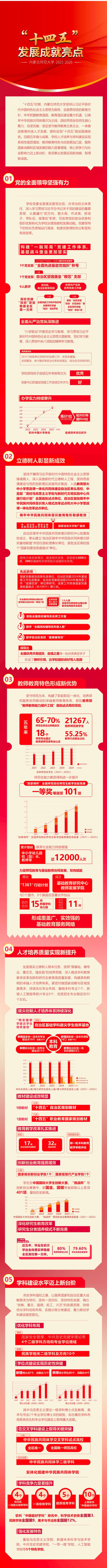 五年来,学校坚守为党育人、为国育才初心使命,大力弘扬和践行教育家精神,着力构建面向未来的拔尖创新人才培养体系,培养了一大批扎根边疆、乐教善教的“四有”好老师。主动对接国家和区域重大需求,一体推进教育科技人才发展,持续优化学科布局,强化有组织科研,加强高层次人才引育,深化国际交流合作,全面提升办学综合实力与核心竞争力,为奋力书写中国式现代化内蒙古新篇章贡献了内师力量。