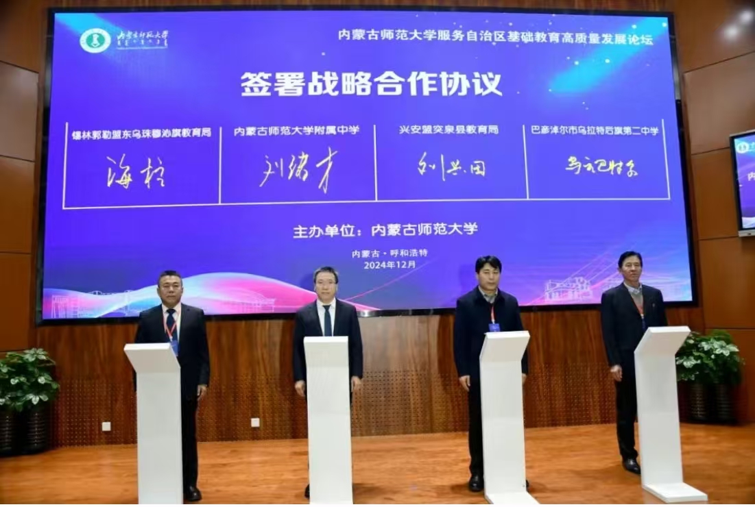 本网讯 12月15日,“协同发展 双向赋能”pp电子官方网站服务自治区基础教育高质量发展论坛在pp电子召开。开幕式上,pp电子官方网站党委委员、副校长韩巍,乌海市副市长王继平,巴彦淖尔市委常委、市政府党组副书记、副市长赵巍峰,鄂尔多斯市乌审旗副旗长范春慧代表校地双方签署战略合作协议。pp电子官方网站附属中学校长刘绪才,兴安盟突泉县教育局局长刘兴田,锡林郭勒盟东乌珠穆沁旗教育局局长海柱,巴彦淖尔市乌拉特后旗第二中学校长乌云巴特尔代表校地双方签署战略合作协议。