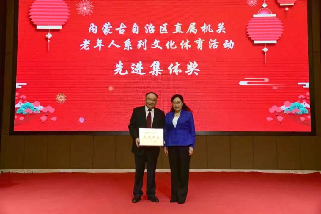 内蒙古直属机关老年人文体协会主席高娃向pp电子颁发了自治区直属机关老年人系列文化体育活动“先进集体”奖。自治区老年书画协会副会长兼秘书长段建平向pp电子颁发了自治区老年书画协会“先进集体”奖并赠送了书法作品。