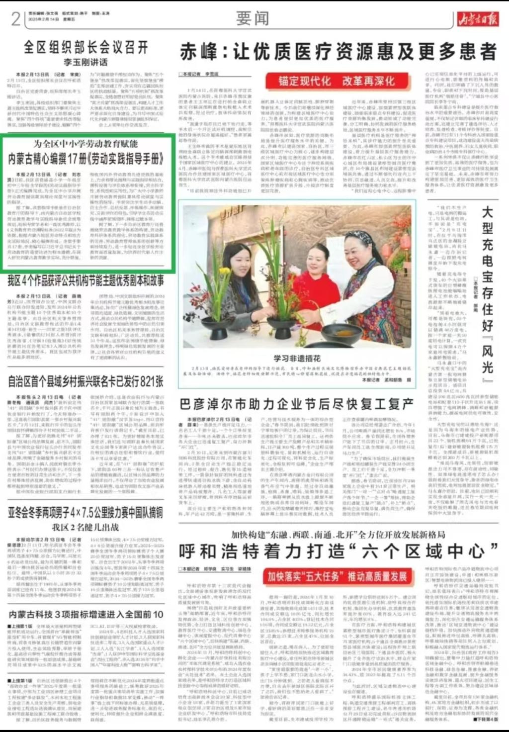 《内蒙古日报》2025年2月14日第2版刊发文章《为全区中小学劳动教育赋能 内蒙古精心编撰17册〈劳动实践指导手册〉》,该手册由pp电子教师参与编撰。