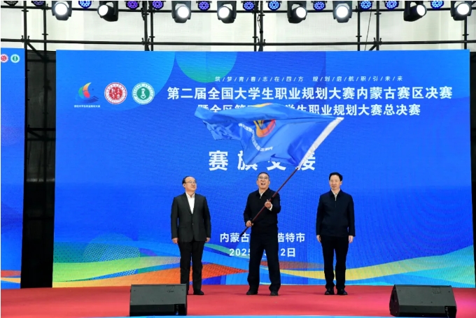 活动最后进行了大赛会旗交接,全区第五届大学生职业规划大赛将由内蒙古工业大学承办。