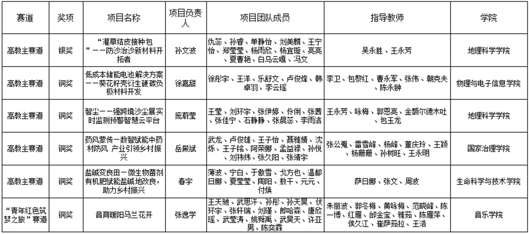 pp电子地理科学学院《“灌草结皮接种包 ”——防沙治沙新材料开拓者》荣获高教主赛道银奖;物理与电子信息学院《低成本储能电池解决方案——葵花籽壳衍生硬碳负极材料开发》、地理科学学院《智尘——强跨境沙尘暴实时监测预警智慧云平台》、国家治理学院《药风蒙传—数智赋能中药材防风 产业引领乡村振兴》、生命科学与技术学院《盐碱变良田—微生物菌剂有机肥赋能盐碱地改良,助力乡村振兴》四个项目获得高教主赛道铜奖;音乐学院《音育暖阳马兰花开》获得“青年红色筑梦之旅”赛道铜奖。