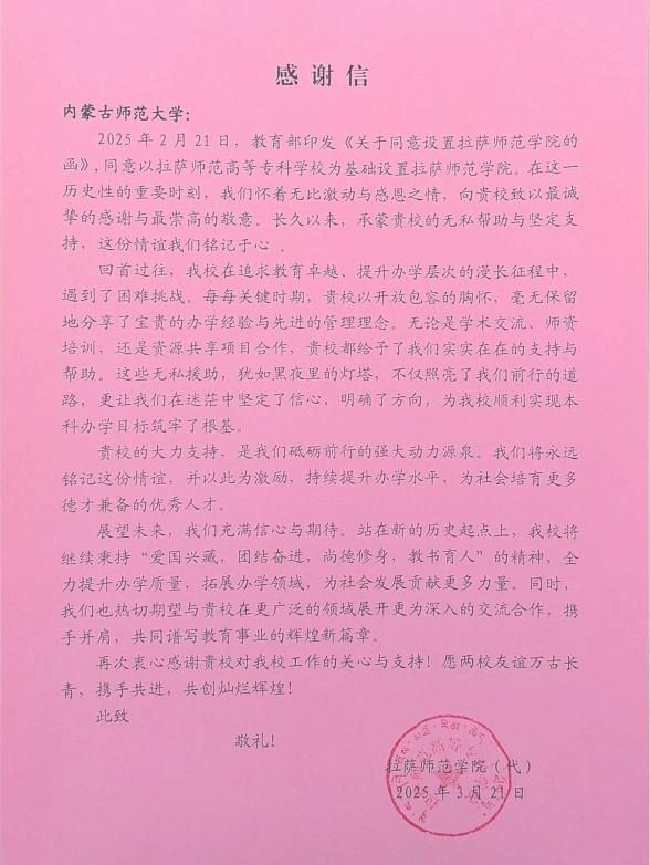 近日,拉萨师范高等专科学校向pp电子发来感谢信,就pp电子在其申请设置“拉萨师范学院”过程中,依托师范教育协同提质计划平台,分享办学经验,进行资源共享,提供学术交流、师资培训和项目合作支持表示诚挚谢意。