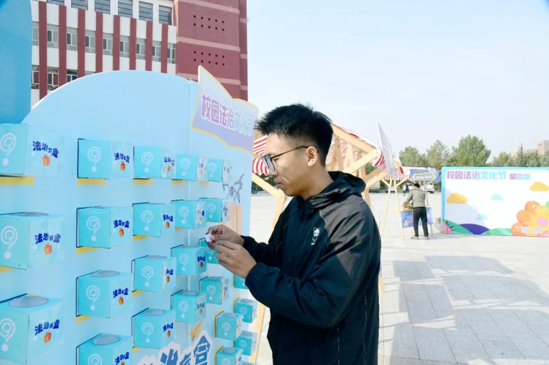 活动以法治游园形式,精心设计了七大活动区域,每个区域都围绕着法律知识展开,设置“法条拼贴诗”“法治连连看”“法治谜语”“法治盲盒”“法治沙龙”等趣味横生关卡制互动游戏,参与活动学生凭借累计的积分兑换不同等级的纪念周边,让学生们在轻松愉快的氛围中学习法律知识。在“法治留言墙”上,参加活动的同学们纷纷写下参与此次活动的感受和对法治社会的期待。一句句真挚的话语不仅表达了学生们对法治的敬畏与热爱,也展现了他们积极向上的精神风貌。