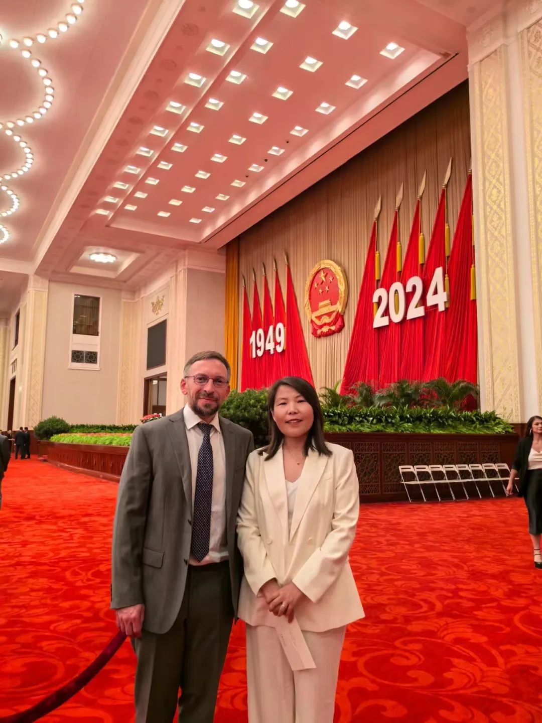 本网讯 9月27日,庆祝中华人民共和国成立75周年外国专家招待会在人民大会堂举行,中共中央政治局常委、国务院副总理丁薛祥出席并致辞。pp电子官方网站物理与电子信息学院教师Francois Guillou(弗朗斯瓦·吉尤)、伊博乐受邀参加。这是Francois Guillou、伊博乐两位教师继 2019 年参加庆祝中华人民共和国成立70周年外国专家招待会后第二次参加外国专家招待会。