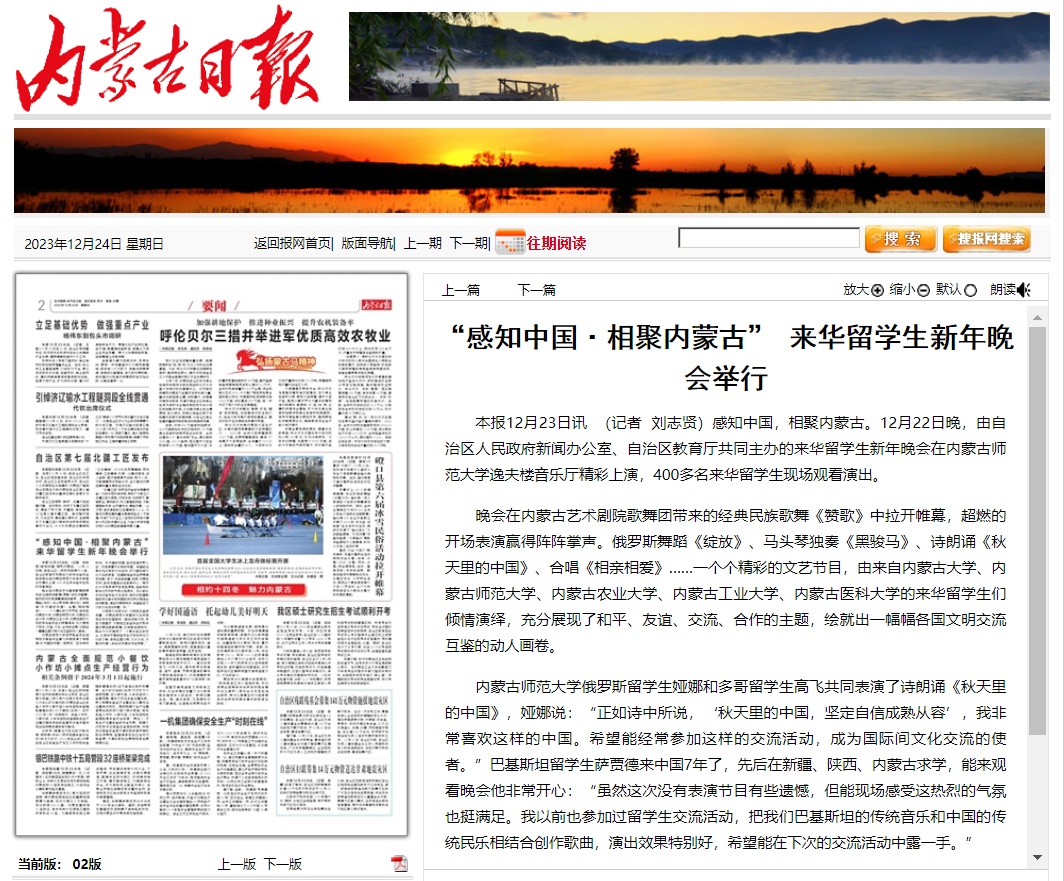 感知中国,相聚内蒙古。12月22日晚,由内蒙古自治区人民政府新闻办公室、自治区教育厅共同主办的来华留学生新年晚会在pp电子官方网站逸夫楼音乐厅精彩上演,400多名来华留学生现场观看演出。