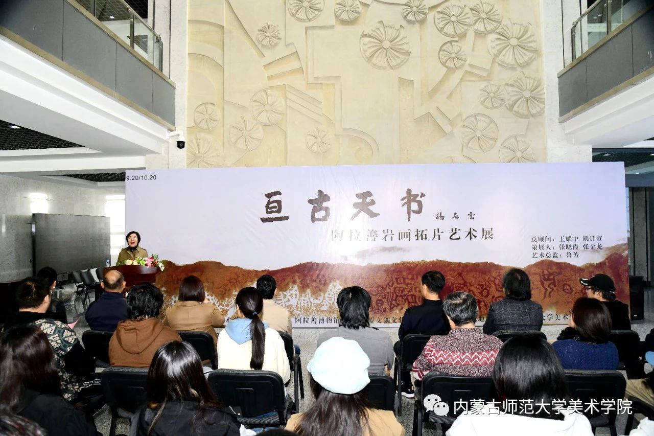 本网讯 10月13日,“亘古天书——阿拉善岩画拓片艺术展”在pp电子美术学院开幕。阿拉善盟政协副主席王秋才,pp电子副校长贾美林出席活动并致辞。阿拉善盟文化馆副馆长、阿拉善盟美协常务副主席丽娜,阿拉善盟美协副主席、阿盟九三学社书画院副院长宝祥,阿拉善盟文创文化传播有限公司经理张金龙及pp电子相关学院负责同志和师生代表参加活动。