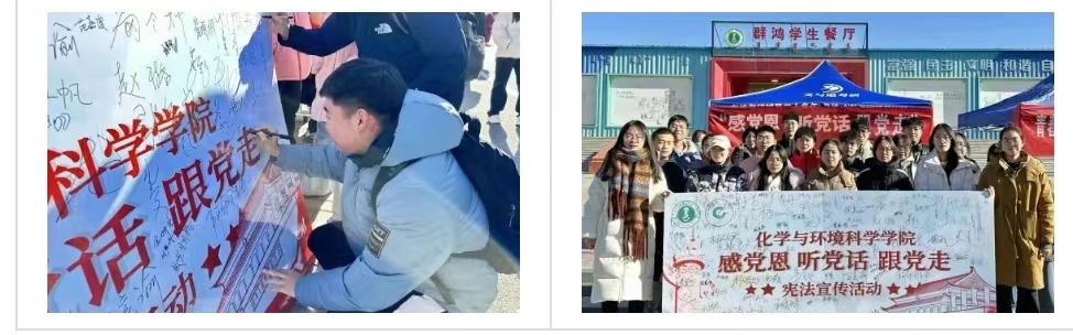 12月1日至3日,化学与环境科学学院师生在盛乐校区群鸿餐厅西侧举办了“感党恩 听党话 跟党走”宪法宣传活动。活动中,宣讲人员向现场师生讲解了宪法的重要意义,并围绕宪法宣传周活动主题、总体要求,宪法的基本原则、主要特征、修改时间以及宪法宣誓誓词等内容进行了有奖问答采访活动。