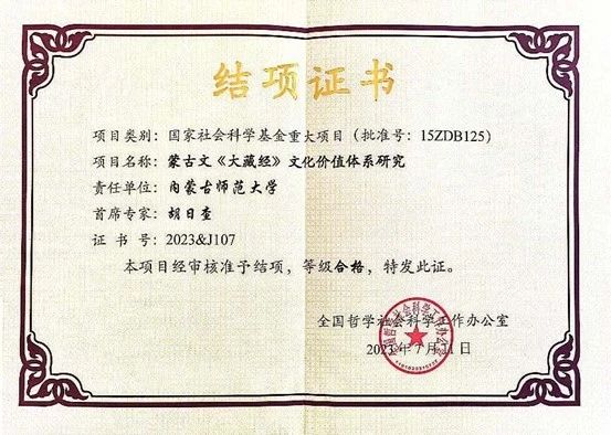 本网讯 近日,pp电子民族学人类学学院教师胡日查主持的国家社会科学基金重大项目“蒙古文《大藏经》文化价值体系研究”( 15ZDB125)圆满完成研究任务,在会议鉴定获得同行专家一致肯定的基础上,经全国哲学社会科学工作办公室审批,获“合格”等级,顺利通过结项验收。