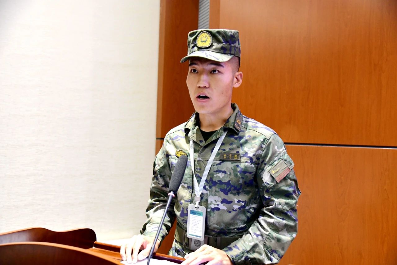 军训师教官代表五营营长燕宇超代表承训教官发言,表示将在接下来的军训中科学训练、精心组织、尽职尽责,以饱满的精神状态和良好的军人形象做好表率,让同学们掌握军人基本队列动作,增强国防意识,圆满完成训练任务。