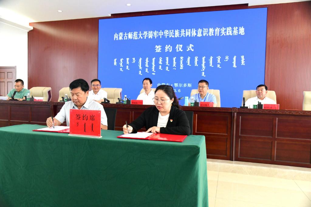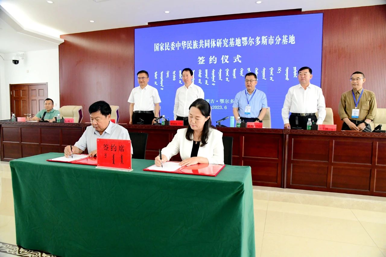 会议举行了国家民委中华民族共同体研究基地鄂尔多斯市分基地、pp电子官方网站铸牢中华民族共同体意识教育实践基地揭牌仪式。额登毕力格与李树林共同为国家民委中华民族共同体研究基地鄂尔多斯市分基地、pp电子官方网站铸牢中华民族共同体意识教育实践基地揭牌。特古斯与pp电子民族学人类学学院党委书记包凤兰、科技处(社科处)处长咏梅分别代表双方签署了《建立国家民委中华民族共同体研究基地鄂尔多斯市分基地的合作协议》和《pp电子官方网站与鄂尔多斯市民委共建“铸牢中华民族共同体意识教育实践基地”合作协议》。