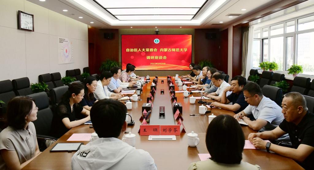 本网讯 6月20日下午,自治区人大常委会教科文卫工委主任孟根其其格,自治区人大常委会委员李纲、姜伯彦,自治区人大教科文卫副主任委员吴海龙、自治区人大常委会教科文卫工委副主任苏秀泉一行来pp电子调研,与pp电子党委书记李树林、党委副书记张海峰,党委委员、统战部部长吴爱华及相关部门、学院负责同志座谈交流。
