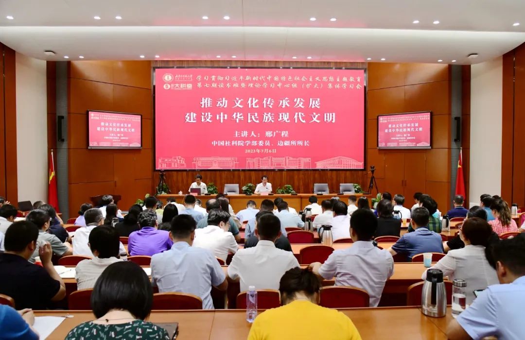 本网讯 近日,pp电子在赛罕校区信息楼报告厅举办学习贯彻习近平新时代中国特色社会主义思想主题教育第七期读书班暨理论学习中心组(扩大)集体学习会,邀请中国历史研究院中国边疆研究所所长邢广程作了题为“推动文化传承发展,建设中华民族现代文明”的辅导报告。学校党委中心组成员、全校副处级以上干部、马克思主义学院教师和学生代表聆听了报告。报告会由党委书记李树林主持。