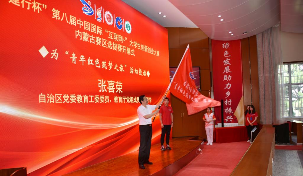 自治区党委教育工委委员、教育厅党组成员、总督学张喜荣为“青年红色筑梦之旅”活动授旗