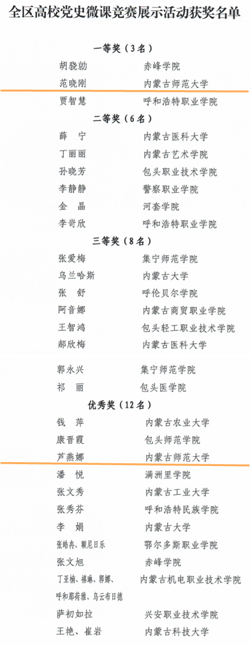本网讯 为深入推动党史学习教育走深走实,2021年4月至12月,自治区教育厅联合自治区党委宣传部共同举办了全区高校党史微课竞赛展示活动。活动开展以来,广大高校教师踊跃参加,以百年党史为基本教材、以红色事迹和典型故事为生动素材,用心用情创作了一大批富有政治性、思想性和感染力的优秀党史微课作品,为思想政治理论课教学增加了宝贵资源。经过初赛、复赛和专家组评审,共评选出一等奖3名、二等奖6名、三等奖8名、优秀奖12名。pp电子教师范晓刚荣获一等奖、芦燕娜荣获优秀奖。