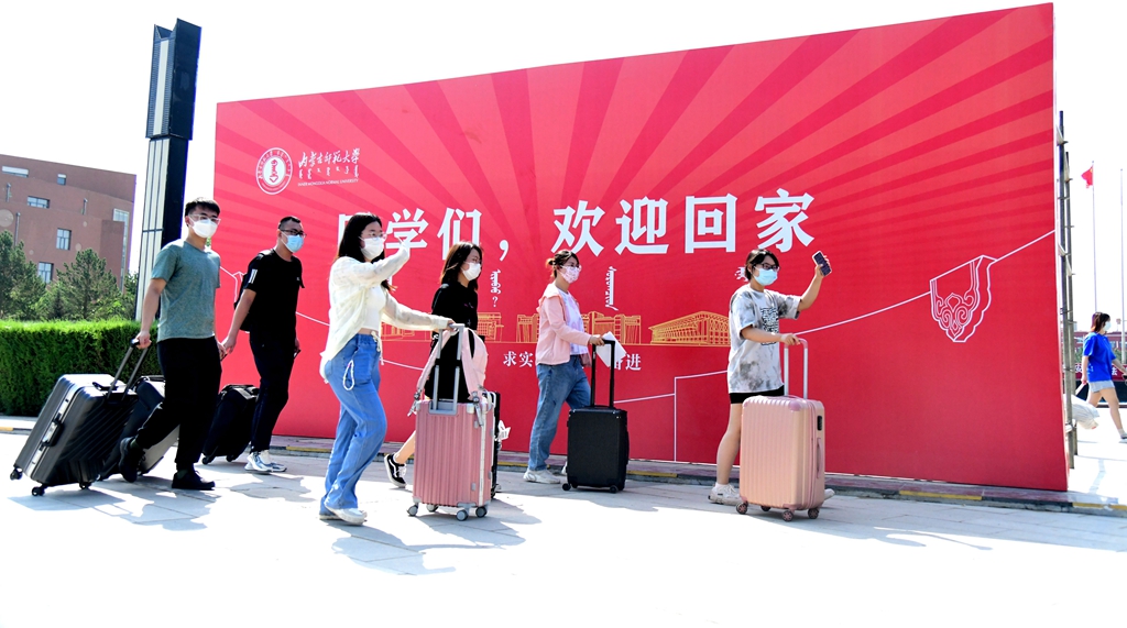 本网讯“同学们,欢迎回家”,6月19日,红彤彤的超大展板立在盛乐校区大门口。经过严格的入校防疫检查、消杀等环节,同学们陆续走进校门。一早,党委书记阿拉坦仓,党委副书记、校长李树林,党委委员、副校长宫箭等校领导、老师们就在校门口等候,迎接同学们返校。