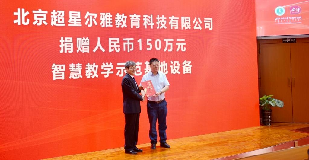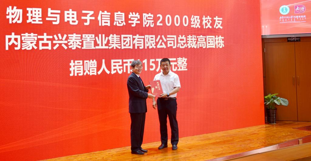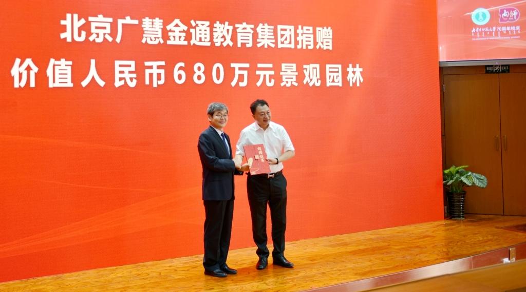 焦殿成向学校捐赠价值680万元景观园林,高国栋向学校捐赠115万元人民币,秦波涛向学校捐赠价值150万元教学示范基地设备。阿拉坦仓代表学校接受捐赠,并为捐赠者颁发捐赠证书。