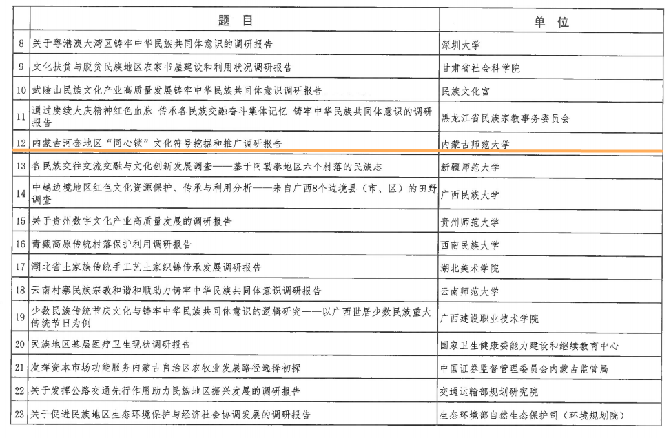 pp电子申报的两篇调研报告成功入选获奖名单。其中,pp电子党委书记阿拉坦仓主持的《内蒙古自治区教育领域推进铸牢中华民族共同体意识调研报告》荣获“二等奖”,民族学人类学学院教师张时空主持的《内蒙古河套地区“同心锁”文化符号挖掘和推广调研报告》荣获“优秀奖”。
