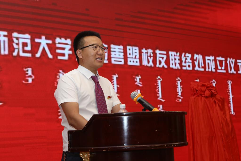 王来喜代表学校对阿拉善盟校友联络处的成立表示祝贺,对多年来关心和支持母校建设与发展的广大校友和承办仪式的阿拉善盟委、行署表示衷心的感谢。他说,各位校友秉承母校“献身、求实、团结、奋进”的校训,为社会经济发展贡献了自己的力量,为母校赢得了良好的声誉,树立了美好的形象。在学校即将迎来70周年华诞之际,阿拉善盟校友联络处的成立,为广大“内师人”搭建了一个互通信息、联络感情、增进友谊的平台。希望各位校友依托校友联络处,进一步加强与母校的沟通和联系,实现母校与校友事业的共同发展。