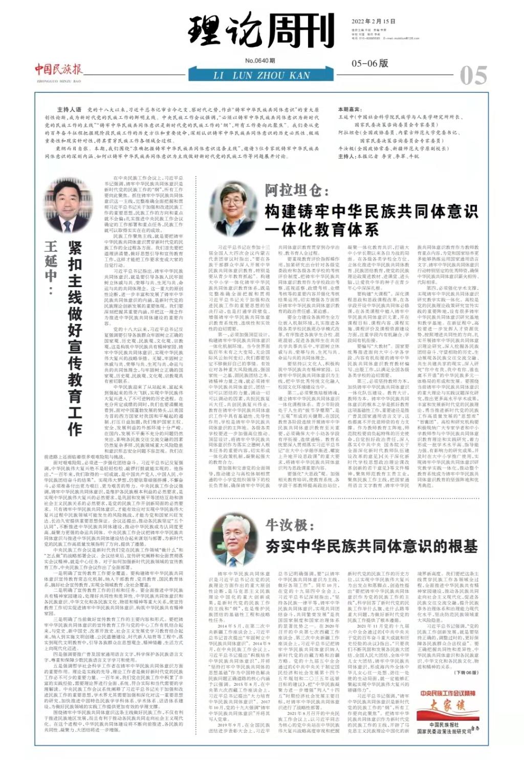 2月15日,《中国民族报》第5版《理论周刊》邀请pp电子党委书记阿拉坦仓等3位专家围绕“准确把握铸牢中华民族共同体意识这条主线”,就铸牢中华民族共同体意识的深刻内涵、如何以铸牢中华民族共同体意识为主线做好新时代党的民族工作等问题展开讨论。阿拉坦仓书记发表了题为《构建铸牢中华民族共同体意识一体化教育体系》的理论文章。