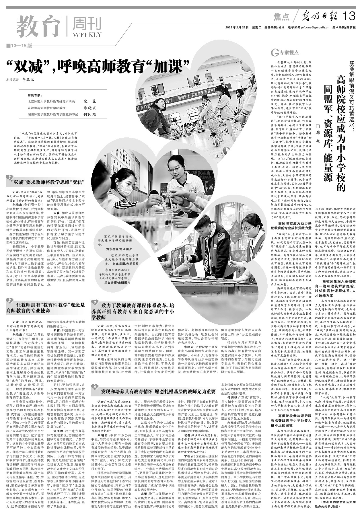 高师院校是教育理论研究的重要阵地。当前,面对“强化学校育人主阵地作用”这一命题,基础教育管理者迫切需要厘清实践背后的逻辑,系统设计育人体系,精准攻坚。一线教师则需重新确立专业成长的方向,实现自身能力的变革,让工作落地。针对这些思考,应当释放高校师生和学术团队的力量,从问题导向出发,把经验传递、目标升级作为整体关切点,双方共同研判政策指引、未来需求、当前教学复杂性等改革议题的专业性走向,从而促发自觉和反思性实践,抬高基础教育发展新空间。