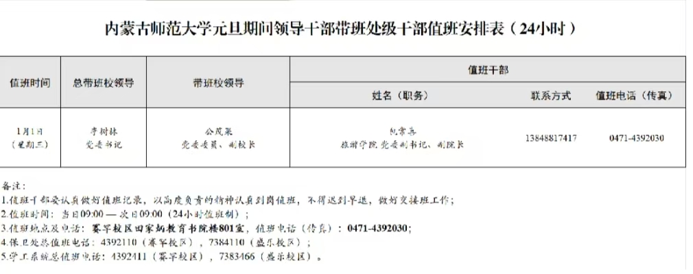寒期期间,各单位自行安排本单位值班工作,各单位领导需保持通讯畅通。国家法定节假日,则按照学校总值班规定执行,学校总值班室实行24小时值班制度,值班干部要按规定在岗值班,严禁擅离职守。学校总值班室设在赛罕校区田家炳教育书院楼801室,值班电话(传真):0471-4392030。如遇到突发情况或重大事件要严格履行报告制度,第一时间向相关校领导请示报告,迅速、有效处置和化解。