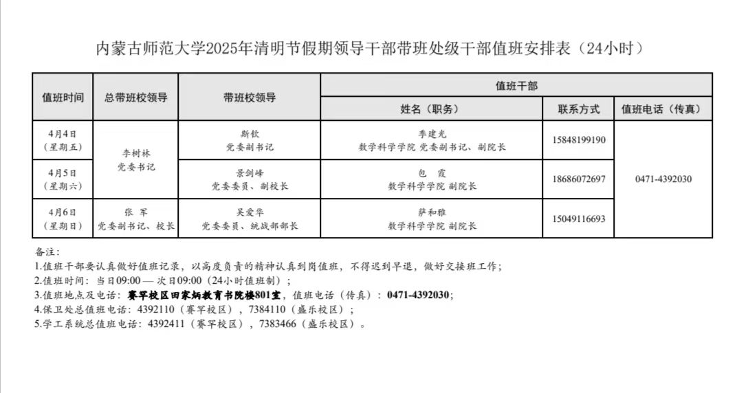 1.值班期间,学校总值班室,设在赛罕校区田家炳教育书院楼801室,值班电话(传真):0471—4392030;